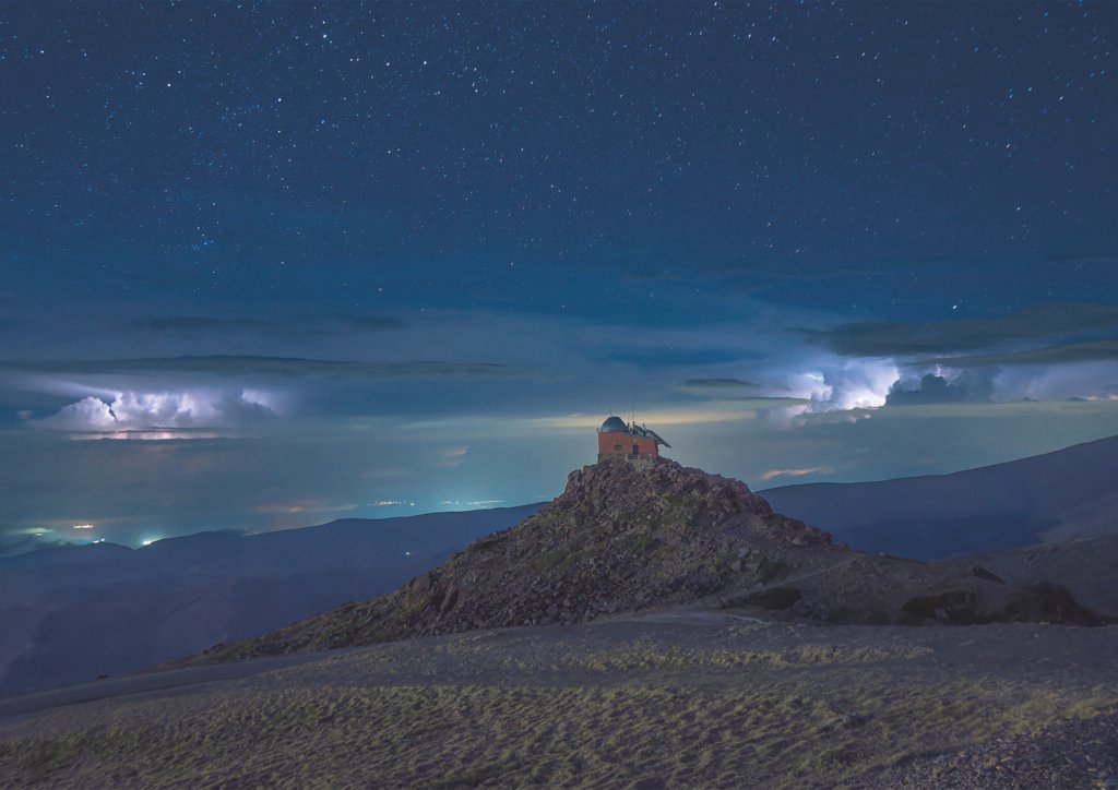 Aquesta fotografia captura la immensitat del cel nocturn, on la quietud de les estrelles conviu amb la força indomable d’una tempesta llunyana. Els llamps trenquen la foscor i revelen els volums dels núvols, creant un contrast dramàtic amb la serenitat del firmament. En primer pla, un observatori astronòmic s’alça solitari sobre la muntanya, com un punt de trobada entre el coneixement humà i la grandesa de la natura, recordant-nos la petitesa de l’ésser humà davant els fenòmens còsmics i atmosfèrics.