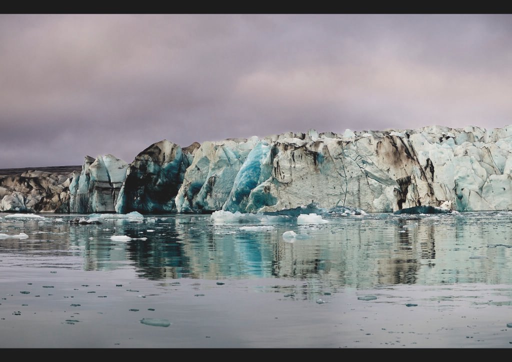 Un mur de gel antic s’alça sobre l’aigua quieta, esquerdat per franges fosques de cendra i sediment que revelen la memòria geològica del paisatge. Els tons blaus intensos emergeixen de l’interior del glaç, resultat de la neu comprimida durant dècades fins a transformar-se en cristall gairebé pur.