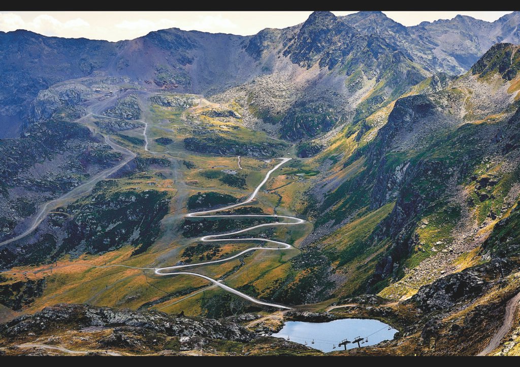 Una carretera de muntanya dibuixa un traç sinuós sobre la vall, com un llapis blanc que ressegueix el relleu fins perdre’s entre cims escarpats. Els prats d’alta muntanya, esquitxats de roques i colors de tardor, contrasten amb la duresa mineral de les crestes, suggerint un paisatge tant fràgil com indomable.
