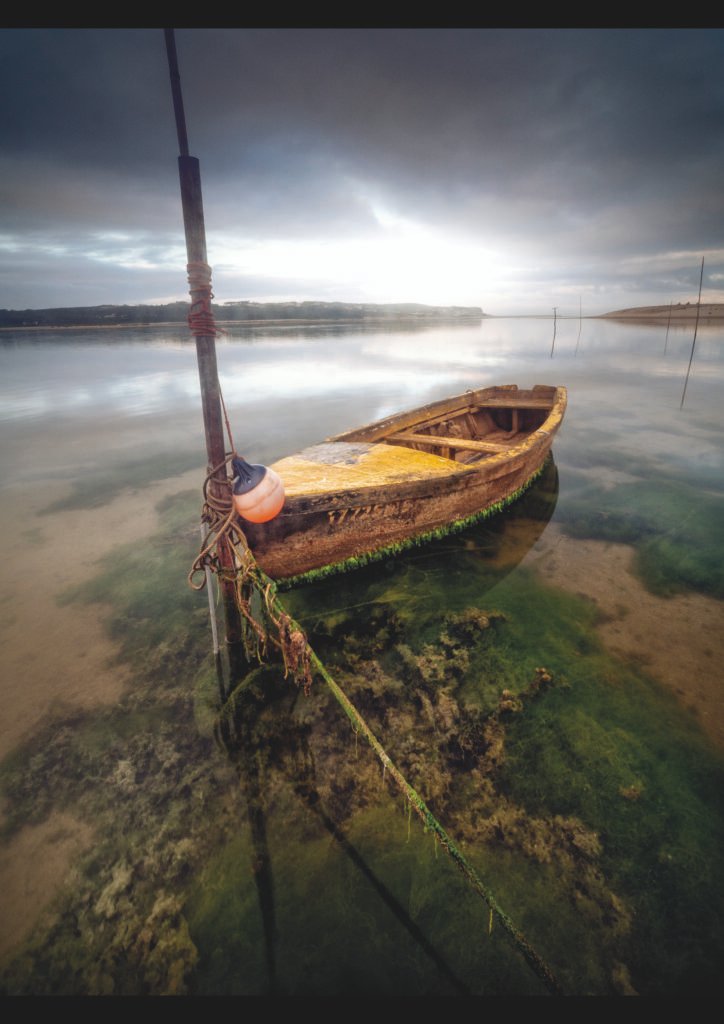Una barca de fusta gastada reposa immòbil a l’aigua rasa, lligada a un pal solitari mentre la marea dibuixa textures verdes d’algues al fons. La llum suau que s’obre entre els núvols il·lumina la coberta humida i converteix l’estampa en un moment de quietud, com si el temps al port s’hagués aturat.