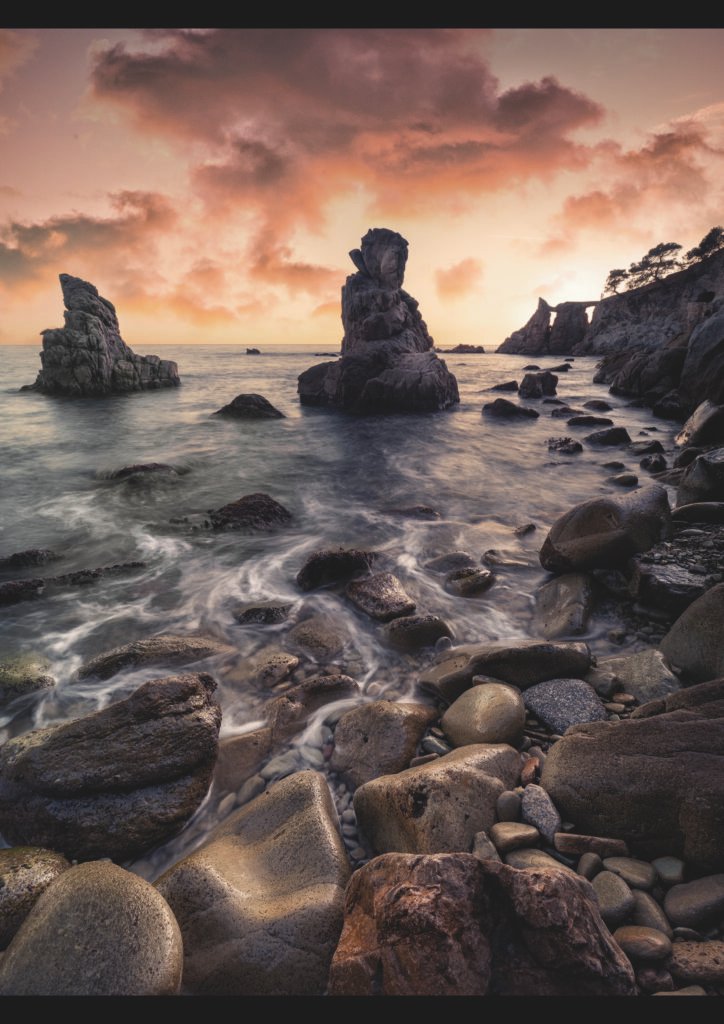 Les roques s’alcen com figures immòbils dins l’aigua, mentre les onades llisquen entre els còdols deixant-hi un vel fi d’escuma que sembla dibuixar el pas del temps. El cel encès del capvespre envolta aquestes formes minerals i transforma la cala en un escenari gairebé mític, on la llum i la pedra dialoguen en silenci.