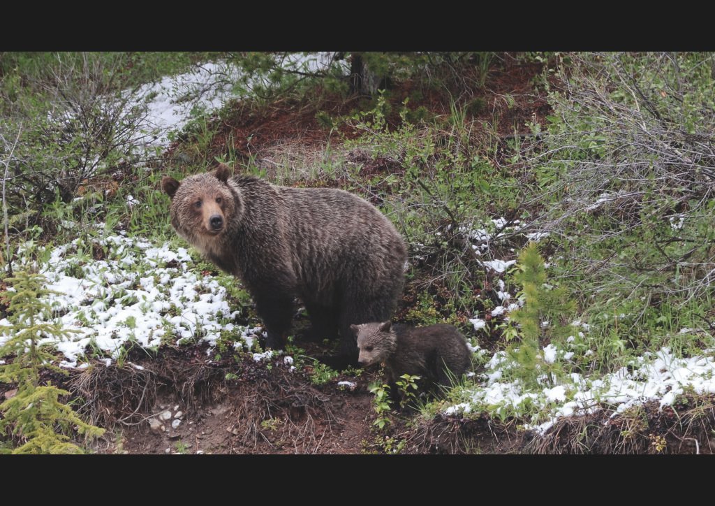 Una imponent osa parda de pelatge marró clara vigila amb mirada alerta el seu osezno, tots dos drets sobre un pendent amb matolls verds esquitxats de neu tardorenca. L’escena transmet tendresa i protecció en un hàbitat natural de transició hivernal, amb el petit cub al costat de la mare en un moment d’intimitat salvatge.