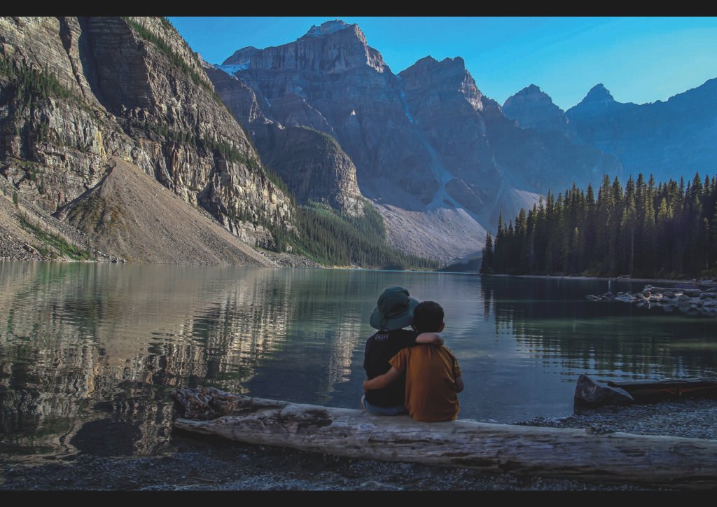 Un amb barret verd i un altre amb samarreta taronja seuen abraçats sobre un tronc assecat a la vora del llac, contemplant en silenci la grandesa de les muntanyes. L’aigua turquesa reflecteix els pics rocosos del Vall de les Deu Cims sota un cel blau clar esquerdat per núvols suaus, capturant un instant de connexió humana amb la natura imponent.