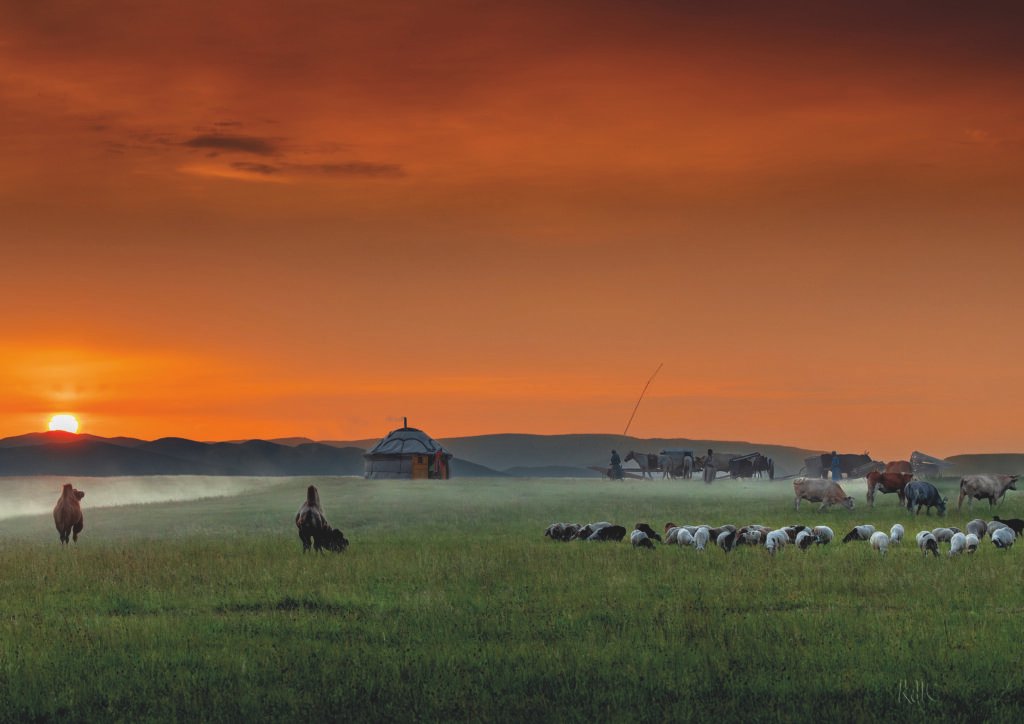Un yurt tradicional de feltre vermell destaca enmig d’un prat verd infinit, amb ramats de cavalls i ovelles pasturant sota la llum càlida del sol poni. Un pastor amb barret mongol guia els animals cap a l’horitzó nebliós, mentre el cel s’encén en tons taronja i el sol es fon darrere de turons suaus.