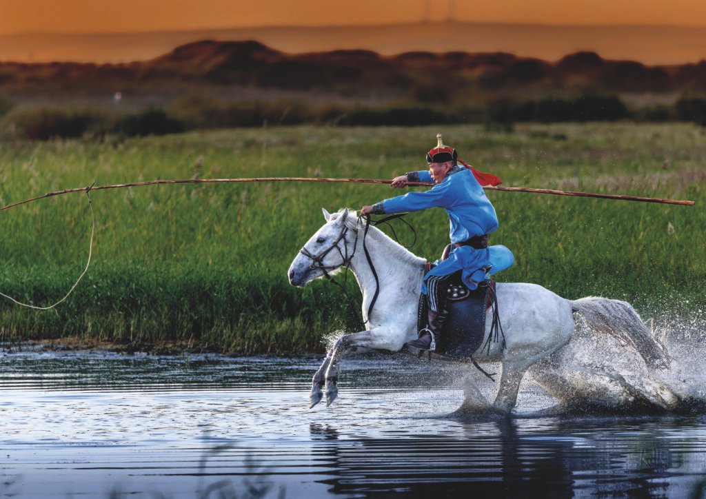 Un genet mongol amb vestit tradicional blau i casc emplomatat galopa amb gràcia sobre un cavall blanc pur, brandant una llarga canya de pesca o llança mentre esquitxa l’aigua del llac. El sol poni tingeix el cel d’ocres i vermells, reflectint-se en l’aigua i el prat verd, capturant l’essència dinàmica d’un esport ancestral.
