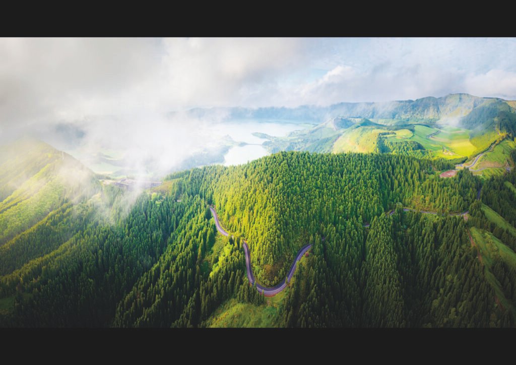 Una carretera sinuosa de color gris vermell talla un tapís de bosc laurissilvae dens i verd intens, envoltada de camps grocs i un embassament o llac en primer terme. El cel gris amb núvols suaus i boira crea una atmosfera mística sobre les muntanyes volcàniques, destacant la simetria natural de l’illa.