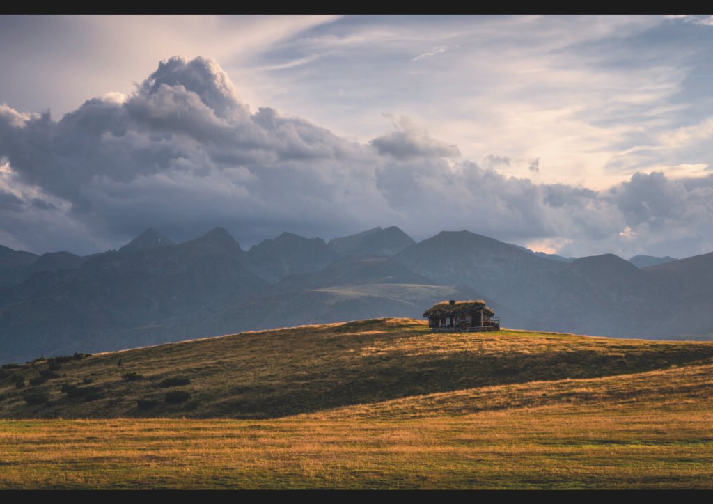 Una petita cabana de fusta amb sostre de palla es troba aïllada en un turó àrid de finals d’estiu, envoltada de prats secs amb feixos de fenc i roques disperses. Al fons, muntanyes escarpades amb formes piramidal s’elevan sota un cel carregat de núvols dramàtics, amb llum càlida que accentua la solitud.
