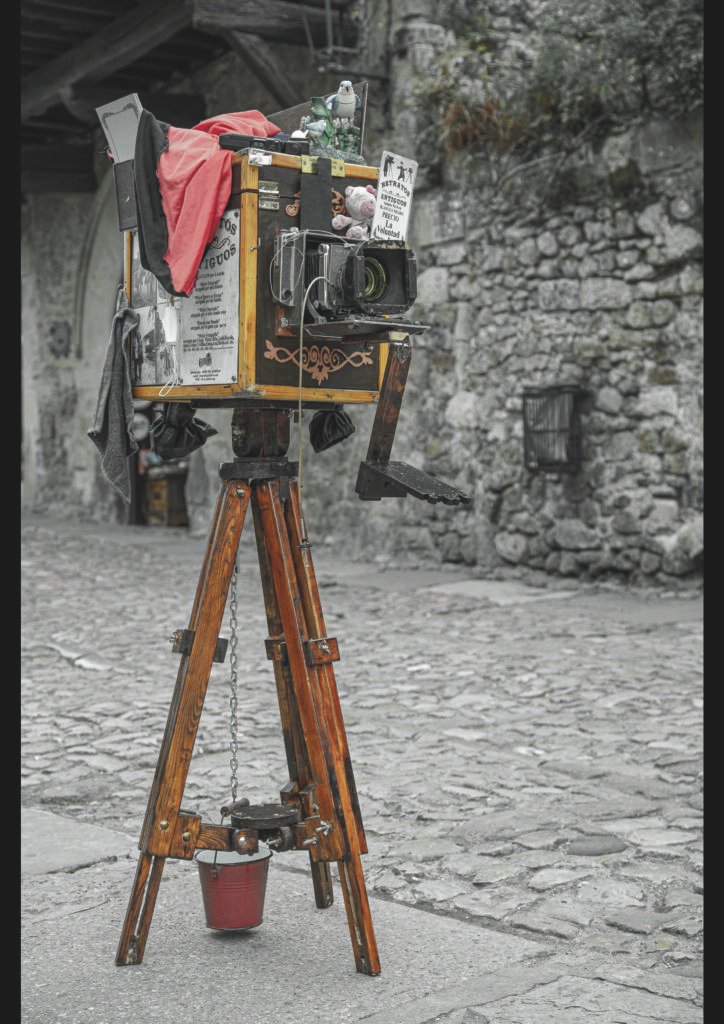 Una càmera fotogràfica antiga de fusta i llata, amb objectiu gran i manivella lateral, es troba montada sobre un trípode robust enmig d’un carrer empedrat. Objectes quotidians com roba vermella, ampolles i cartells envolten la màquina, contrastant amb el mur de pedra rústic i creant una instal·lació artística que evoca el pas del temps.