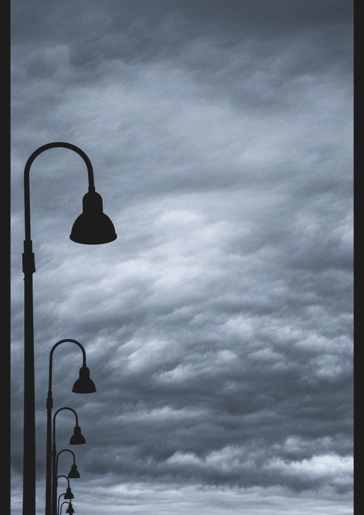 Una filera de fanals de carrer antics, amb formes corbes i capes esfèriques, es perfilen en silueta negra contra un cel gris carregat de núvols pesants i amenazadors. La composició vertical crea una sensació de tensió i simetria, com si els fanals esperessin el primer llampec en una plaça buida.