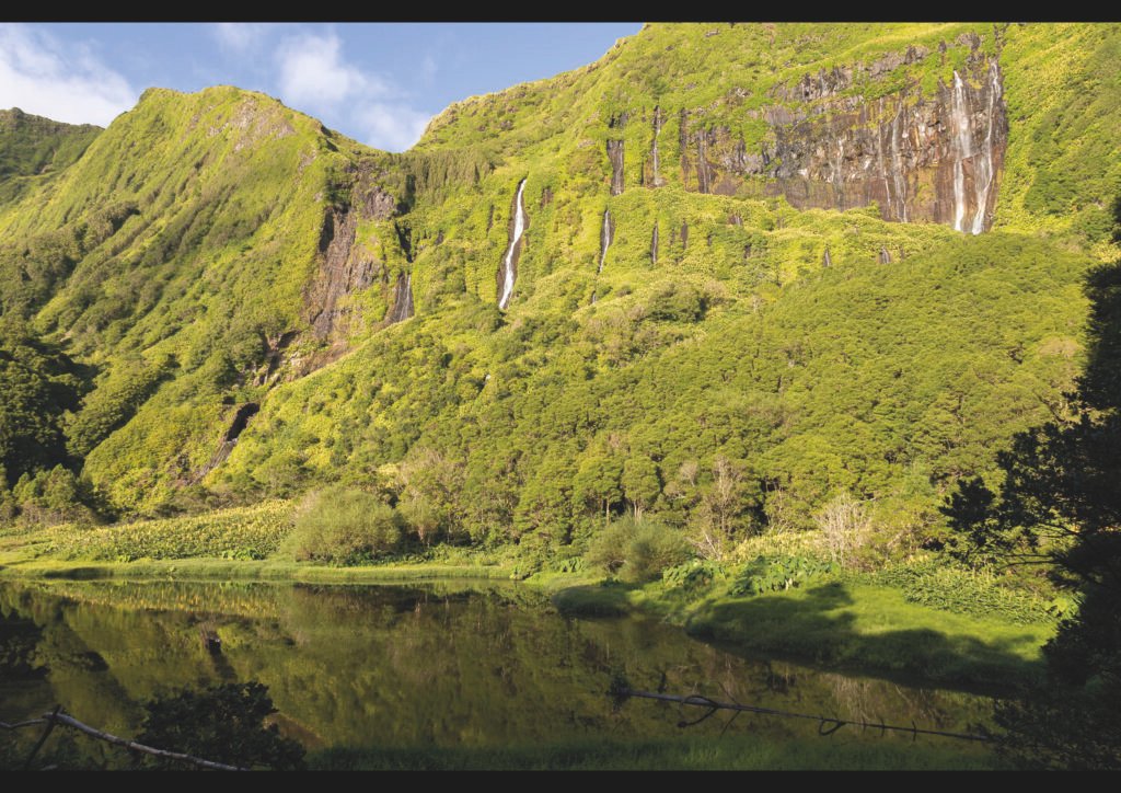 Un amfiteatre de muntanyes cobertes d’un verd intens es desploma en parets verticals d’on neixen fils d’aigua que cauen com cortines fines sobre la vall. El llac en calma als peus del cingle reflecteix aquest paisatge exuberant i converteix l’escena en un mirall natural on la llum i la vegetació es fonen en un sol quadre.