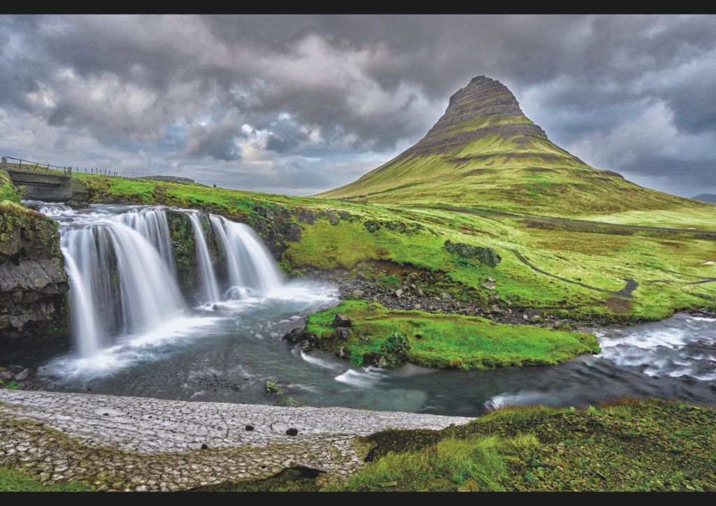Un salt d’aigua es desplega en diversos cortinatges blancs que llisquen suaument sobre la roca fosca abans de fondre’s en un riu de tons turquesa. Al fons, la silueta piramidal de la muntanya s’alça sobre la plana de molsa verda, com un far mineral que domina l’horitzó sota un cel carregat de núvols