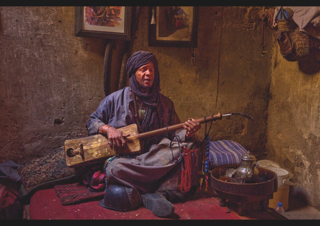 Un home tureg, amb el rostre marcat pel temps i els vents, acaricia les cordes d’un tidinit de fusta gastada en una cambra de fang il·luminada per una llum càlida. Les teies, els tapissos i els recipients de coure envolten l’escena, creant un ambient íntim on la música sembla néixer de l’ànima mateixa del desert.