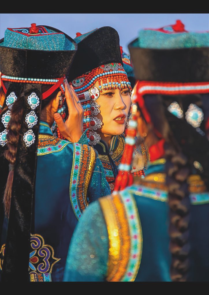 Un grup de dones mongoles es reuneix en cercle, les seves cares il·luminades per la llum càlida del capvespre, amb somriures tímids i mirades plenes de complicitat. Els seus vestits tradicionals deel en tons turquesa brillen amb brodats daurats i vermells, coronats per barrets alts adornats amb corall i turqueses que capturen els últims raigs del sol.