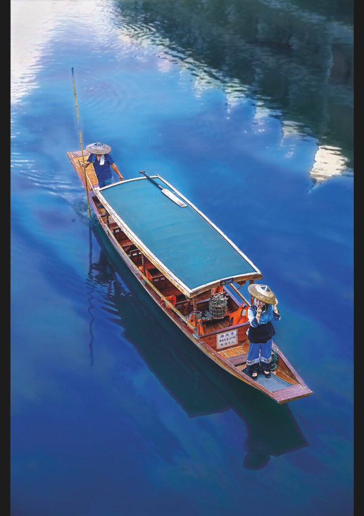 Una barca sampan tradicional de fusta, coberta amb una teulada verda blava, sura suaument en un riu d’un blau profund que reflecteix els arbres i el cel. Dues dones amb barrets cònicos nón lá i vestits senzills guien l’embarcació amb rems, evocant la vida quotidiana dels pescadors vietnamites en un paisatge serè i simètric.