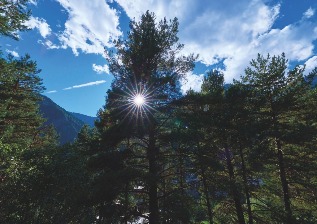Els raigs del sol filtren amb força a través de les branques d’un pi solitari, creant una explosió de llum que il·lumina el bosc de coníferes i les muntanyes llunyanes. El cel blau esquerdat per núvols blancs i una estela d’avió emmarquen aquest paisatge alpí, evocant la frescor i la grandesa d’una vall en ple dia radiant.