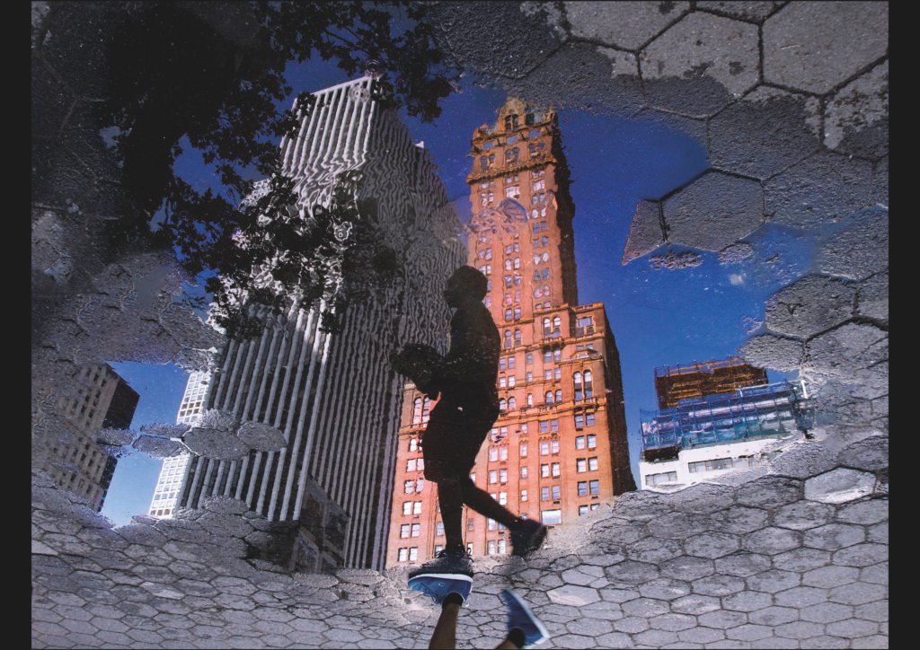 Una silueta humana camina decidida sobre una vorera humida, amb les seves sabates esportives i pantalons capturats en primer terme sobre un toll hexagonal que actua com a portal òptic. A través del reflex de l’aigua, emergeix l’edifici vermell de maó amb torre gòtica del Woolworth Building, envoltat de gratacelós moderns i fulles d’arbre sota un cel blau clar, creant una il·lusió surrealista d’un altre món urbà.