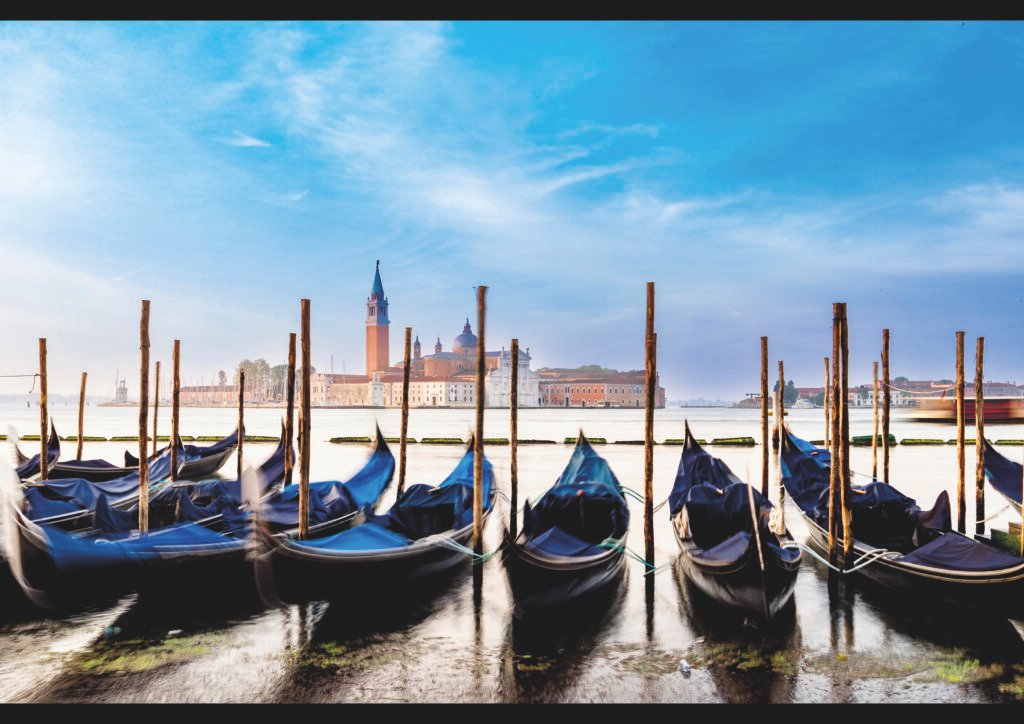 Una filera de gòndoles negres, amb les seves proes esveltes apuntant al cel, es mouen lleugerament sobre l’aigua tèbia de la llacuna, capturades en la llum suau de l’alba o capvespre. Al fons, l’illa de San Giorgio Maggiore es dreça amb la seva façana palladiana i campanar blanc, símbol de serenitat enmig del cel blau esquerdat per núvols suaus.
