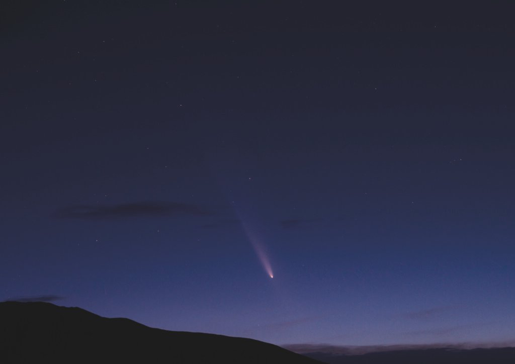 Un cometa brillant amb cua allargada travessa el cel nocturn profund, amb el seu cap blanc i polsós destacant sobre un fons de estrelles i núvols suaus. La silueta fosca d’una carena muntanyosa marca l’horitzó, capturant un moment efímer de l’astronomia visible a ull nu des de llocs foscos.