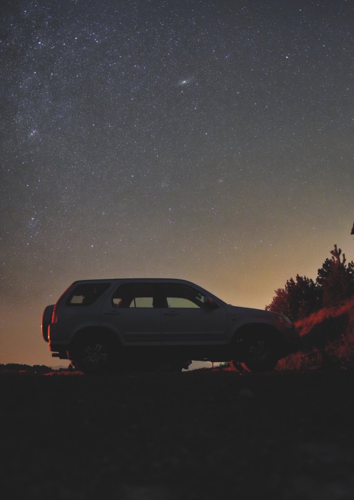 Un SUV blanc, possiblement un Honda, es perfila en silueta contra l’horitzó boscos, amb la seva forma robusta destacant sota el cel estrellat. La Via Làctia s’arqueja brillant des de l’horitzó fins al zenit, amb densitat de pols estel·lar i tons vermells suggerint captació en alta muntanya amb cel excepcionalment fosc.