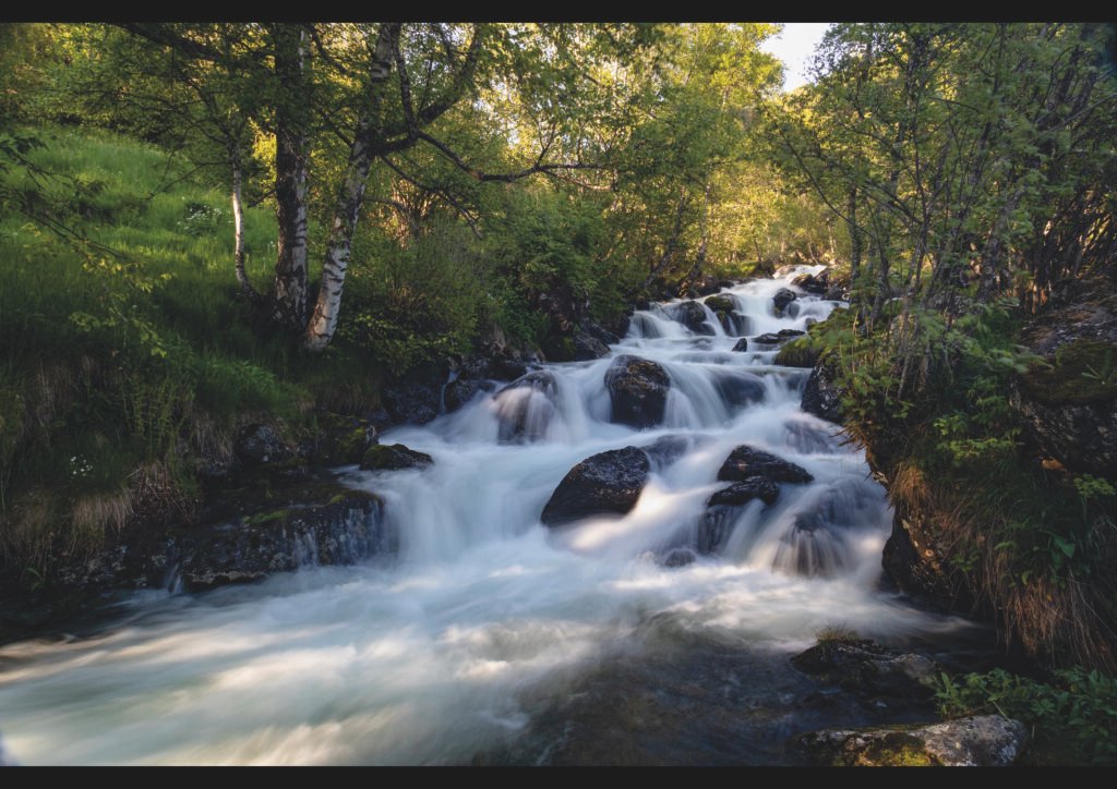 L’aigua cristal·lina baixa en escalons suaus sobre roques negres, creant vores de velló blanc que contrasten amb el verd intens del molsa i les fulles dels bedolls al voltant. La llum càlida de l’hora daurada il·lumina el bosc fosc, transformant aquesta cascada en un flux vital enmig d’un paisatge fèrtil i primigeni.