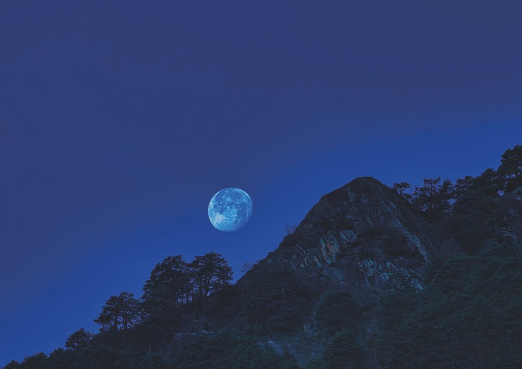 Una lluna supermes gran i plena, amb cràters definits i tocs blaus, s’alça majestàticament just darrere d’un penya-segat rocós cobert de pins foscos i densos. L’horitzó nocturn profund i el contrast entre la llum lunar i les siluetes dels arbres crea una atmosfera mística i serena.